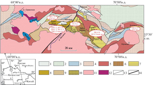 Degtyarev K.E., Tolmacheva T.Y., Tretyakov A.A. et al. Cambrian-Lower Ordovician complexes of the Kokchetav Massif and its fringing (northern Kazakhstan): Structure, age and tectonic setting // Geotectonics. 2016. V. 30. № 1. P. 71–142.