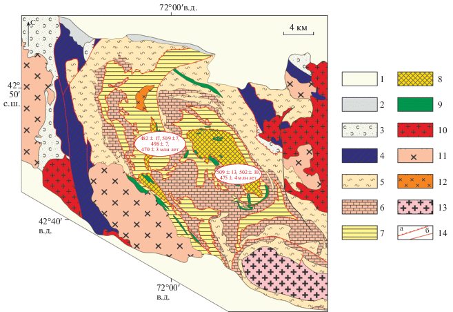 | 532 ± 58 млн лет | 497 ± 5 млн лет | Ядра цирконов 1421 ± 13 млн лет | ||||