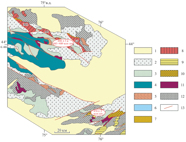 Alexeiev D.V., Kröner A., Hegner E. et al. Middle to Late Ordovician arc system in the Kyrgyz middle Tianshan: From arc-continent collision to subsequent evolution of a Palaeozoic continental margin // Gondwana Res. 2016. V. 39. P. 261–291.