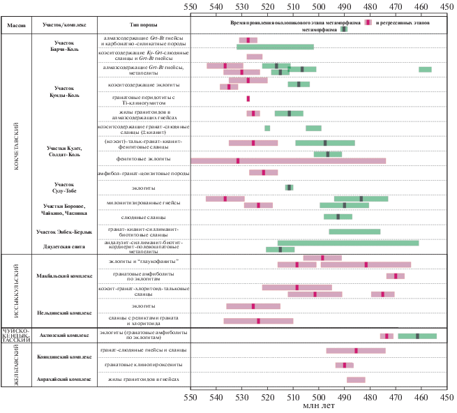 Метаморфические образования высоких и сверхвысоких давлений, которые включаются в состав комплексов фундамента массивов, традиционно рассматривались в качестве древнейших и относились к архею–нижнему протерозою (Недовизин, 1963; Абдулин и др., 1980; Козаков, 1993). Во многих случаях среди метаморфических пород фундамента отмечались эклогиты, гранатовые амфиболиты, гранат-слюдяные гнейсы и сланцы, вопросы генезиса которых оставались дискуссионными (Абдулкабирова, 1946; Ефимов, 1962; Соболев, 1977; Кушев, Виноградов, 1978; Ефимов и др., 1983; Добрецов и др., 1989; Козаков, 1993). В последние десятилетия высоко- и ультравысокобарические образования изучались в пределах многих докембрийских массивов в западной части Центрально-Азиатского пояса. Было установлено, что пик метаморфизма этих пород в пределах Кокчетавского, Иссыккульского (Северо-Тяньшаньского), Чуйско-Кендыктасского, Жельтавского и Ишим-Нарынского (Ишим-Срединно-Тяньшаньского) массивов приходится на кембрий–ранний ордовик (Tagiri et al., 1995; Shatsky et al., 1999; Zhang et al., 1997; Okamoto et al., 2000; Katayama et al., 2001; Togonbaeva et al., 2009; Orozbaev et al., 2010; Kröner et al., 2012; Meyer et al., 2013; Rojas-Agramonte et al., 2013; Klemd et al., 2014 и др.). Находки микровключений алмаза и коэсита в минералах метаморфических пород Кокчетавского и Иссыккульского массивов (Розен и др., 1972; Sobolev, Shatsky, 1990; Tagiri et al., 1995; Корсаков и др., 1998; Korsakov et al., 2007 и др.) совместно с другими минералого-петрологическими и микроструктурными признаками, а также новые геохронологические данные позволили утверждать, что формирование подобных образований связано с субдукцией различных горизонтов континентальной коры на глубины до 120 км и последующим выведением высоко- и ультравысокобарических пород на более высокие гипсометрические уровни. Было установлено, что высокобарические комплексы характеризуются длительной коровой предысторией, которая предполагает вовлечение докембрийских образований в раннепалеозойские субдукционные и коллизионные процессы (Shatsky et al., 1999; Kröner et al., 2007, 2012; Konopelko et al., 2012; Дегтярев и др., 2014; Rojas-Agramonte et al., 2014; Третьяков и др., 2016; Deg-tyarev et al., 2017).