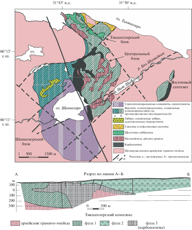 Тикшеозерский ультрамафит-щелочно-карбонатитовый комплекс площадью около 24 км2, прорывает архейские гранито-гнейсы и раннепалеопротерозойские граниты (рис. 1). Его северная граница скрыта под акваторией оз. Тикшеозера; восточная и южная границы, из-за плохой обнаженности, проводятся в основном по данным буровых и геофизических работ. Прослежена только западная граница комплекса с архейскими гнейсами, но и она проходит по зоне совместного рассланцевания. На некотором удалении от главного тела комплекса располагаются небольшие сателлиты, крупнейшим из которых является Восточный сателлит размером 0.7 × 2 км.