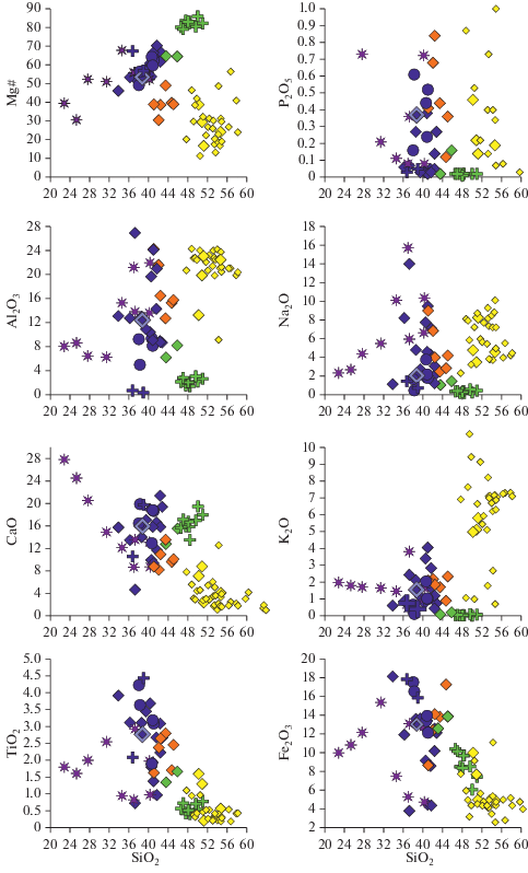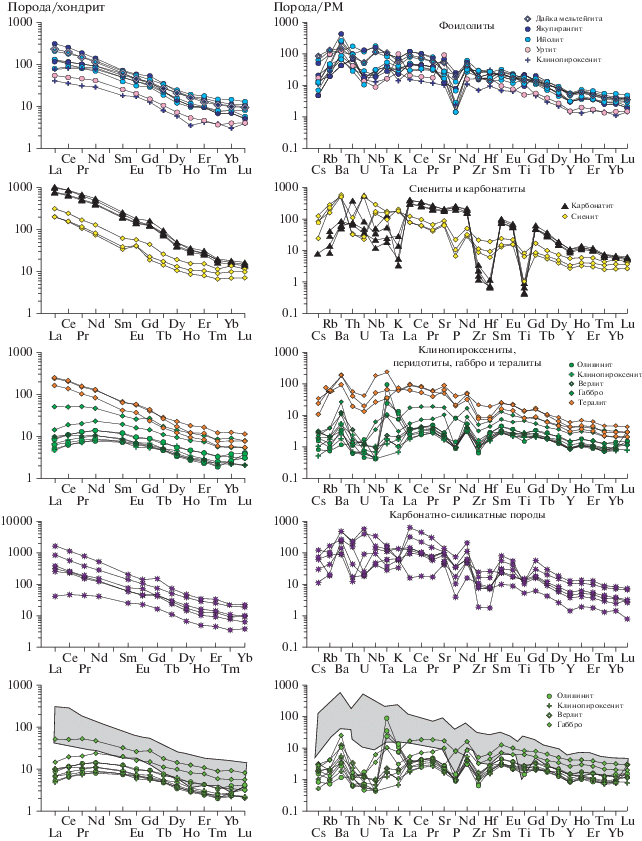 Несмотря на довольно широкую распространенность этих устойчивых ассоциаций и почти вековую историю их изучения, вопрос о характере взаимосвязи карбонатитов и силикатных пород в подобных комплексах до сих пор остается дискуссионным (Woolley, Church, 2005; Gill, 2010 и др.). Во множестве предложенных гипотез, объясняющих феномен появления карбонатитовых магм, их формирование часто рассматривается вне связи с пространственно ассоциирующими с ними силикатными магмами. Обычно предполагается, что возникновение карбонатитовых магм было связано с плавлением карбонатизированных мантийных перидотитов литосферной мантии при высоких Р-Т параметрах и низкой степени частичного плавления (Yaxley et al., 1991; Kogarko, Zartman, 2007; Гирнис, 2003; Brey et al., 1991). По мнению (Kogarko, Veselovsky, 2019), источник такой карбонатизации литосферной мантии связан с подъемом головных частей мантийных плюмов, где в результате адиабатического плавления на глубинах 200–300 км образуется большое количество летучих компонентов, главным образом СО2.