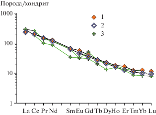 В ИПТМ для определения использовался квадрупольный масс-спектрометр X-7 (Thermo Scientific, США). Разложение производилось автоклавным методом с добавлением трасеров, содержащих 8 мг/л 146Nd, 5 мг/л 161Dy и 3 мг/л 174Yb, по методике, описанной Карандашевым и др. (2016). Разложение образцов пород проводили путем кислотного вскрытия преимущественно в открытой системе. Пороги обнаружения для РЗЭ, Hf, Ta, Th, U составляли 0.02–0.03 г/т, для Nb, Be, Co – 0.03–0.05 г/т, для Li, Ni, Y – 0.1 г/т, для Zr – 0.2 г/т, для Rb, Sr, Ba – 0.3 г/т, для Сu, Zn, V, Cr – 1–2 г/т. Правильность анализа контролировалась путем измерения международных и российских стандартных образцов GSP-2, ВМ, СГД-1А и СТ-1. Погрешности определения концентраций составляли от 3 до 5 отн. % для большинства элементов.