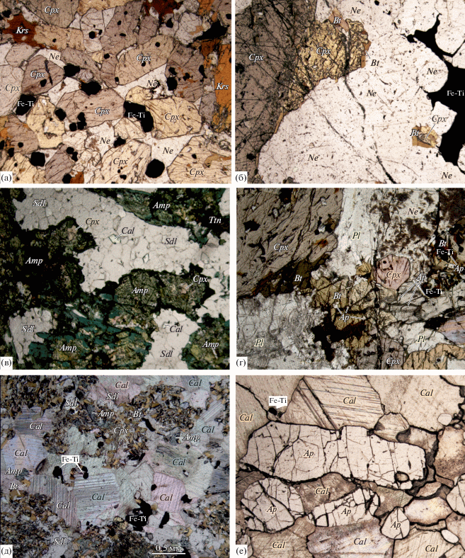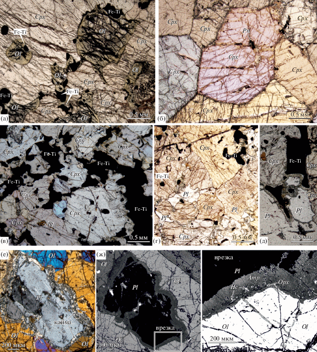 Микрофото структур ультраосновных пород. Вторая фаза: (а) – пойкилитовый верлит, обр. 25-12, без анализатора. Первая фаза: (б) – клинопироксенит, обр. Т18, без анализатора; (в) – рудный клинопироксенит, обр. 41-1-1, без анализатора; (г, д, е, ж) – оливин-плагиоклазовый клинопироксенит: (г) – общий вид, без анализатора, (д) – амфиболовые каймы на контактах Fe-Ti оксидов с плагиоклазом; (е, ж) – структурные соотношения оливина с плагиоклазом (е – николи скрещены; ж – в отраженных электронах); на врезке – фрагмент (ж) детально: контакт оливин-плагиоклаз (в отраженных электронах). Принятые на рис. 2, 3 и 7 сокращения минералов: Ol – оливин, Cpx – клинопироксен, Opx – ортопироксен, Pl – плагиоклаз, Amp – амфибол, Krs – керсутит, Ne – нефелин, Mag – магнетит, Ilm – ильменит, Fe-Ti – сростки магнетита и ильменита, Sdl – содалит, Cal –кальцит, Bt – биотит, Ap – апатит, Ttn – титанит.