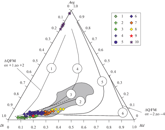 Примечание. 1–19 – клинопироксены ряда диопсид–авгит, 20–23 – эгирины. Породы: первая фаза 1–8: 1 – верлит, 2–4 – оливиновый клинопироксенит и клинопироксенит, 5 – оливин-плагиоклазовый клинопироксенит, 6–8 – габбро; вторая фаза 9–19: 9, 10 – щелочное габбро, 11, 12 – якупирангит, 13–16 – ряд мельтейгит–ийолит, 17–18 – уртит, 19 – тавит. 20–23 – карбонат-силикатные породы. FeO* – суммарное содержание железа в виде FeO. * Номер образца.