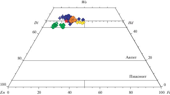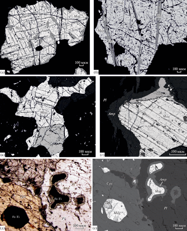 Клинопироксениты и оливиновые клинопироксениты обычно наблюдаются в виде своеобразных неравномернозернистых (от мелко-среднезернистых до, реже, крупнозернистых) кумулатов (рис. 2б). Клинопироксен (до 95 об. % породы) представлен диопсид-авгитом Wo43–47En44–49Fs7–10. В оливинсодержащих разновидностях клинопироксенитов оливин (Fo76–81, см. Supplementary, ESМ_2.xlsx) образует редкие ксеноморфные выделения. Fe-Ti оксиды (сростки ильменита и магнетита) встречаются как в виде мелких включений в клинопироксене, так и в качестве интерстициальных фаз, наряду с сульфидами (главным образом, пирит). В оруденелых разновидностях (рис. 2в) Fe-Ti оксиды развиты преимущественно в форме интерстициального материала, составляющего от 15 до 60 об. %.