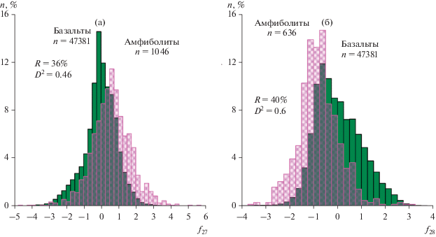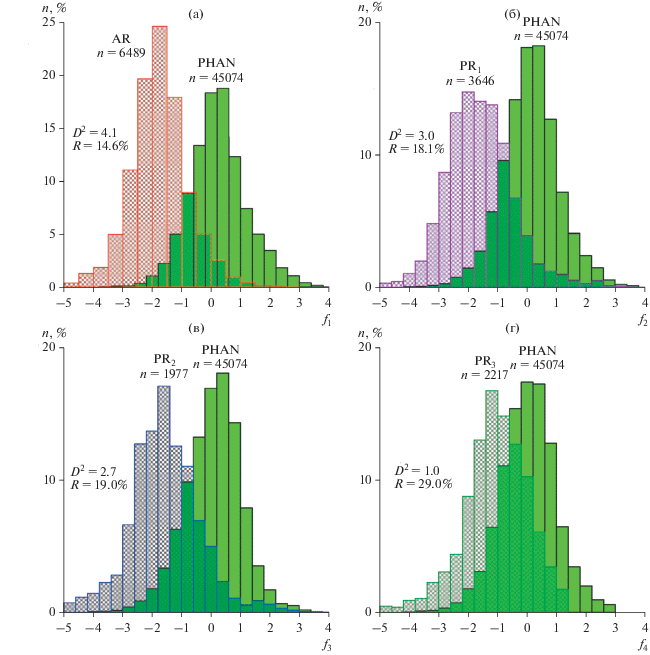 Результаты дискриминантного анализа. (а) – архейских (AR) и фанерозойских (PHAN) базальтов, (б) – палеопротерозойских (PR1) и фанерозойских (PHAN) базальтов, (в) – мезопротерозойских (PR2) и фанерозойских (PHAN) базальтов, (г) – неопротерозойских (PR3) и фанерозойских (PHAN) базальтов. Здесь и на последующих рисунках: R – средневзвешенный риск неправильной классификации (оценка величины области пересечения сравниваемых выборок); n, % – относительный объем выборки; D2 – обобщенное расстояние Махаланобиса, f1, f2, … f30, а также Dx и Dy – дискриминантные функции, формулы расчета которых приведены в табл. 1.