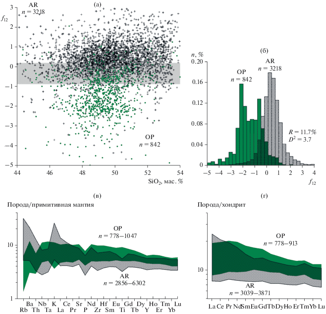 Сравнение химических составов архейских базальтов (AR) и базальтов океанических плато (OP). (а) – диаграмма SiO2–дискриминантная функция f12 с фигуративными точками архейских базальтов (крестики) и базальтов океанических плато (кружки); (б) – распределение значений f12 для архейских базальтов и базальтов океанических плато; (в) – содержания редких элементов в архейских базальтах и базальтах океанических плато, нормированные по примитивной мантии; (г) – содержания редкоземельных элементов в архейских базальтах и базальтах океанических плато, нормированные по хондриту.