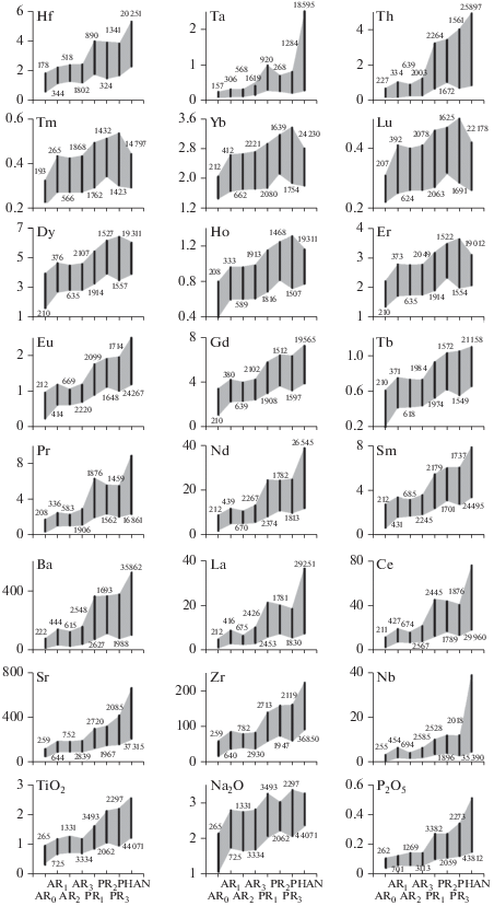 Средние содержания химических элементов (в г/т, оксиды в мас. %) в докембрийских и постдокембрийских базальтах. Интервалы содержаний ограничены квартилями. AR0 – эоархей (>3.8 млрд лет), AR1 – палеоархей (3.2–3.8 млрд лет), AR2 – мезоархей (2.8–3.2 млрд лет), AR3 – неоархей (2.5–2.8 млрд лет), PR1 – палеопротерозой (1.6–2.5 млрд лет), PR2 – мезопротерозой (1.0–1.6 млрд лет), PR3 – неопротерозой (0.54–1.0 млрд лет), PHAN – фанерозой (<0.54 млрд лет).