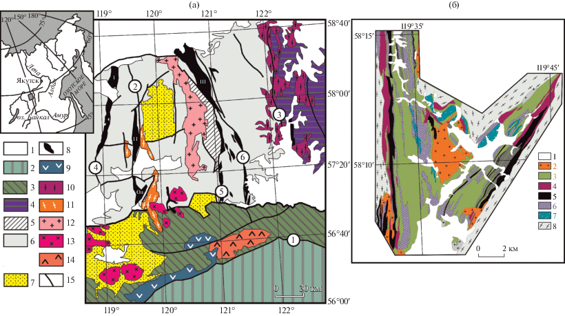 Схематическая геологическая карта западной части Алданского щита (а) и схематическая геологическая карта Олондинского тектонического фрагмента Токко-Ханинского зеленокаменного пояса (б). Составлены с использованием данных (Государственная …, 2010, 2015; Попов и др., 1990). (а): 1 – четвертичные, юрские, кембрийские и венд-рифейские отложения нерасчлененные; 2 – метаморфические и магматические комплексы Джугджуро-Станового супертеррейна Центрально-Азиатского складчатого пояса; 3 – метаморфические и магматические комплексы Станового структурного шва; 4 – метаморфические и магматические комплексы Алданской гранулито-гнейсовой области; 5 – гранулитовые породы (тоналит-трондьемитовые ортогнейсы и метабазиты) Оломокитского блока; 6 – тоналит-трондьемитовые ортогнейсы мезоархейского (Великославинский и др., 2018б и др. ) олекминского комплекса; 7 – метаосадочные породы палеопротерозойского удоканского комплекса; 8 – фрагменты архейских и палеопротерозойских зеленокаменных поясов; 9 – анортозиты каларского комплекса (2623 ± 23 млн лет (Ларин и др., 2006)); 10 – A-граниты нелюкинского комплекса (2398 ± 4–2522 ± 2 млн лет (Котов и др., 2004)); 11 – Ханинский массив A-гранитов; 12 – граниты чародоканского комплекса; 13 – граниты кодарского комплекса (1871–1880 млн лет (Ларин и др., 2012)); 14 – Тасский массив сиенитов и граносиенитов (286 ± 4 млн лет (Глебовицкий и др., 2009)); 15 – главные разрывные нарушения. Цифрами в кружках обозначены зоны разломов: 1 – разлом, 2 – Тарын-Юряхская зона разрывных нарушений, 3 – Амгинский разлом, 4 – Чара-Токкинская зона разрывных нарушений, 5 – Оломокитская зона разрывных нарушений, 6 – Темулякит-Тунгурчинская зона разрывных нарушений. Римскими цифрами обозначены зеленокаменные пояса: I – Чаро-Токкинский, II – Токко-Ханинский, III – Темулякит-Тунгурчинский. Ол – Олондинский фрагмент Токко-Ханинского пояса. (б): 1 – четвертичные отложения; 2 – габбро-плагиогранитовые массивы; 3 – микрогнейсы; 4 – базальты; 5 – коматииты и их туфы; 6 – габбро-амфиболиты; 7 – интрузии оливинитов; 8 – тоналит-трондьемитовые ортогнейсы олекминского комплекса.
