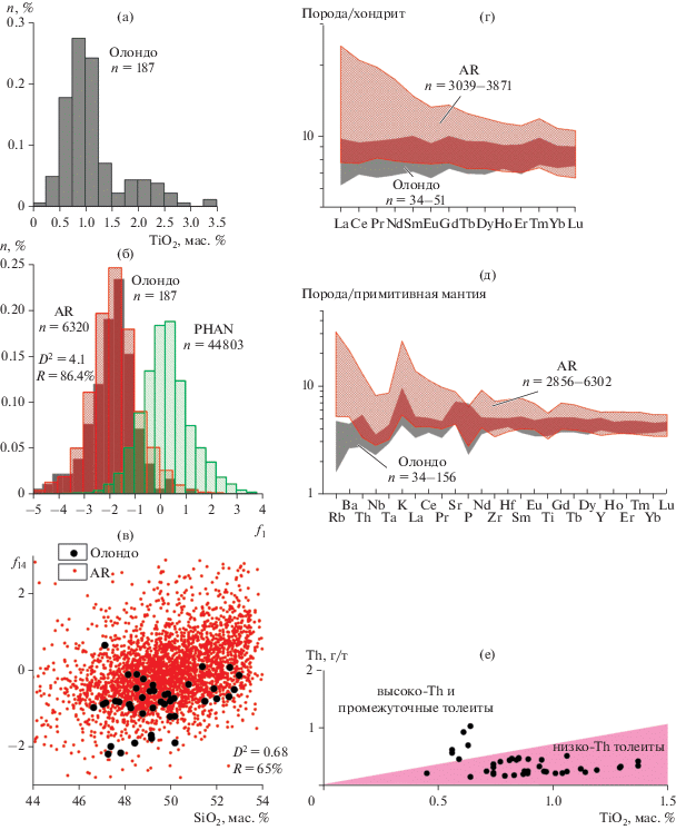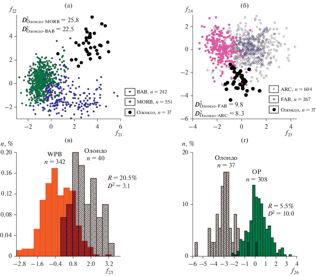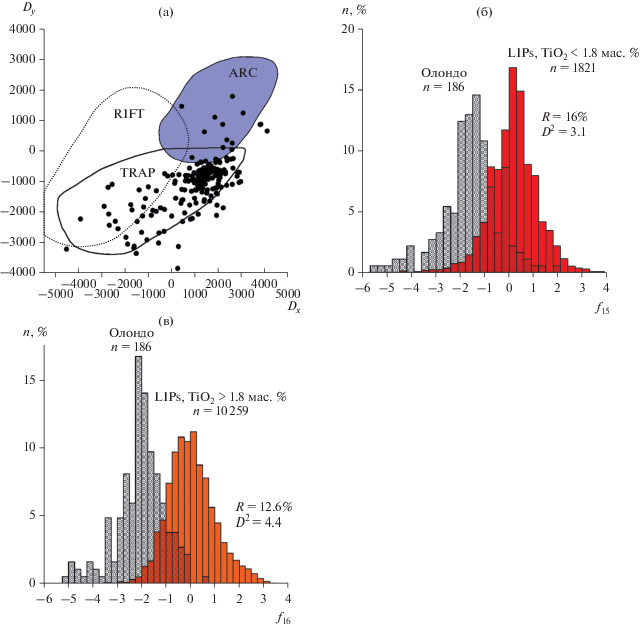 Для разделения базальтов островных дуг и базальтов внутриплитных обстановок по содержанию петрогенных (в том числе и мобильных) элементов была предложена диаграмма Dx–Dy (рис. 15а). На этой диаграмме практически все фигуративные точки составов базальтов Олондинского фрагмента локализованы в поле базальтов внутриплитных обстановок, и только точки единичных образцов попадают в поле базальтов островных дуг. Согласно полученным данным, базальты Олондинского фрагмента должны интерпретироваться как внутриплитные. Однако ранее было показано, что рассматриваемые базальты, как и подавляющее большинство архейских базальтов, отличаются от фанерозойских базальтов и, скорее всего, представляют собой самостоятельный геохимический тип, который не учитывался при построении тектономагматических (геодинамических) диаграмм. Иными словами, заранее неизвестно, в каких полях той или иной тектономагматической диаграммы будут располагаться фигуративные точки составов архейских, а в данном случае олондинских базальтов. В связи с этим результаты, полученные с помощью диаграммы Dx–Dy, требуют дополнительной верификации. Для этого был проведен дискриминантный анализ (принимались во внимание только немобильные главные элементы) выборки базальтов Олондинского фрагмента и низкотитанистых (рис. 15б), и высокотитанистых (рис. 15в) базальтов крупных магматических провинций. Область пересечения базальтов Олондинского фрагмента и базальтов крупных магматических провинций не велика (рис. 15б, 15в), т.е. вероятность интерпретации базальтов Олондинского фрагмента как внутриплитных базальтов крупных магматических провинций даже на основании содержаний неполного набора петрогенных элеменов весьма мала, а результаты распознавания с помощью диаграммы Dx–Dy ошибочны. Таким образом, рассмотренный пример иллюстрирует непригодность тектономагматических диаграмм, основанных на геохимических данных фанерозойских базальтов, для геодинамической типизации архейских базальтов.
