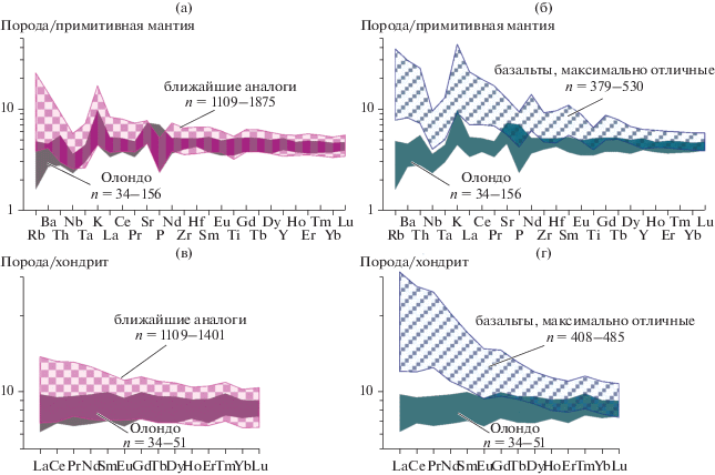 Содержания редких элементов в базальтах Олондинского фрагмента Токко-Ханинского зеленокаменного пояса (Олондо), нормированные по примитивной мантии (а, б), и редкоземельных элементов, нормированных по хондриту (в, г), и в базальтах архейских зеленокаменных поясов разных кратонов, обнаруживающих сходство (а, в) или контрастирующих (б, г) с базальтами Олондинского фрагмента.