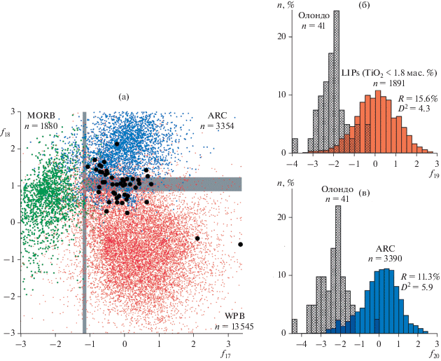 Сравнение химических составов (петрогенные и малые элементы) базальтов Олондинского фрагмента Токко-Ханинского зеленокаменного пояса (Олондо) с составом фанерозойских базальтов крупных магматических провинций (LIPS) и базальтов островных дуг (ARC). (а) – дискриминантная диаграмма f17–f18 с фигуративными точками базальтов Олондинского фрагмента Токко-Ханинского зеленокаменного пояса (залитые кружки). Обозначения полей: ARC – базальты современных островных дуг, MORB – базальты срединно-океанических хребтов, WPB – базальты внутриплитных обстановок. (б) – результаты дискриминантного анализа базальтов Олондинского фрагмента Токко-Ханинского зеленокаменного пояса (Олондо) и постдокембрийских низко-Ti базальтов крупных магматических провинций (LIPs). (в) – результаты дискриминантного анализа базальтов Олондинского фрагмента Токко-Ханинского зеленокаменного пояса (Олондо) и базальтов современных островных дуг (ARC).