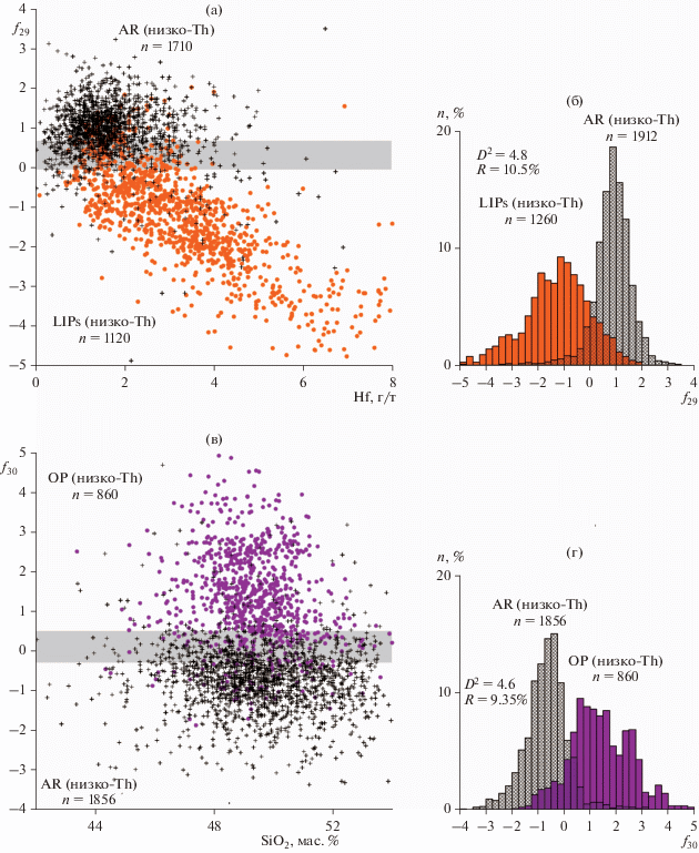 Результаты дискриминантного анализа низко-Th архейских базальтов. (а) – диаграмма Hf–f29 c фигуративными точками низко-Th архейских базальтов и низко-Th базальтов континентальных фанерозойских крупных магматических провинций. (б) – гистограмма распределения значений f29 для низко-Th архейских базальтов и низко-Th базальтов континентальных фанерозойских крупных магматических провинций. (в) – диаграмма SiO2–f30 c фигуративными точками низко-Th архейских базальтов и низко-Th базальтов океанических плато. (г) – гистограмма распределения значений f30 для низко-Th архейских базальтов и низко-Th базальтов океанических плато.