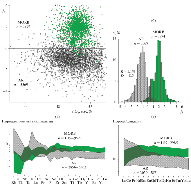 Сравнение химических составов архейских базальтов (AR) и базальтов срединно-океанических хребтов (MORB). (а) – диаграмма SiO2–дискриминантная функция f5 с фигуративными точками архейских базальтов (крестики) и базальтов островных дуг (кружки); (б) – распределение значений f5 для архейских базальтов и базальтов срединно-океанических хребтов; (в) – содержания редких элементов в архейских базальтах и базальтах срединно-океанических хребтов, нормированные по примитивной мантии; (г) – содержания редкоземельных элементов в архейских базальтах и базальтах срединно-океанических хребтов, нормированные по хондриту. Здесь и на последующих рисунках примитивная мантия по (Sun, McDonough, 1989), хондрит по (Taylor, McLennan, 1985), поля составов ограничены верхним и нижним квартилями.