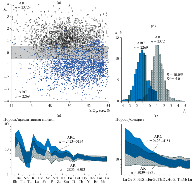 Сравнение химических составов архейских базальтов (AR) и базальтов островных дуг (ARC). (а) – диаграмма SiO2–дискриминантная функция f6 с фигуративными точками архейских базальтов (крестики) и базальтов островных дуг ( кружки); (б) – распределение значений f6 для архейских базальтов и базальтов островных дуг; (в) – содержания редких и рассеянных элементов в архейских базальтах и базальтах островных дуг, нормированные по примитивной мантии; (г) – содержания редкоземельных элементов в архейских базальтах и базальтах островных дуг, нормированные по хондриту. Здесь и на последующих рисунках прямоугольник (серое поле на рис. (а)) – область неопределенности, ограниченная 5-м и 95-м квантилями распределения значений дискриминантной функции, разделяющей сравниваемые выборки.