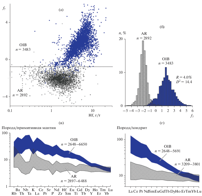 Сравнение химических составов архейских базальтов (AR) и базальтов океанических островов (OIB). (а) – диаграмма Hf–дискриминантная функция f7 с фигуративными точками архейских базальтов (крестики) и базальтов океанических островов (кружки); (б) – распределение значений f7 для архейских базальтов и базальтов океанических островов; (в) – содержания редких элементов в архейских базальтах и базальтах океанических островов, нормированные по примитивной мантии; (г) – содержания редкоземельных элементов в архейских базальтах и базальтах океанических островов, нормированные по хондриту.