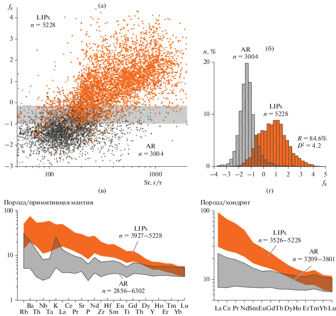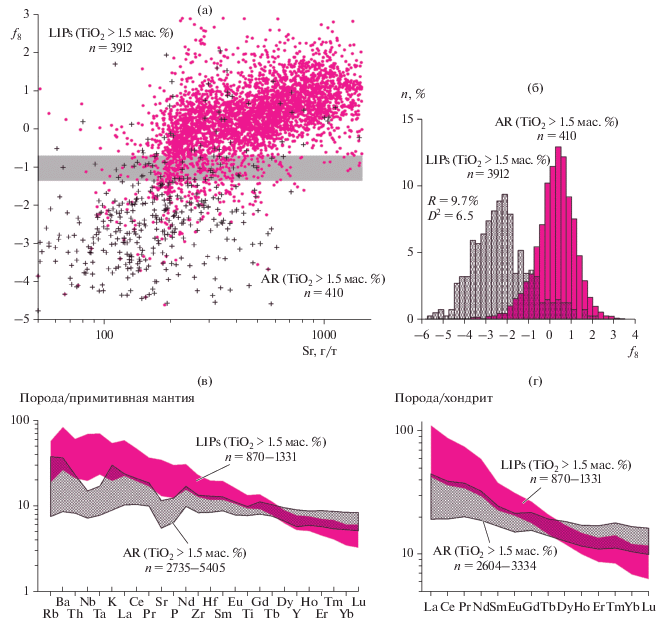 Сравнение химических составов низко-Ti архейских базальтов (AR) и низкотитанистых базальтов крупных континентальных магматических провинций (LIPs). (а) – диаграмма Sr–дискриминантная функция f8 с фигуративными точками архейских базальтов (крестики) и базальтов крупных магматических провинций (кружки); (б) – распределение значений f8 для архейских базальтов и базальтов крупных магматических провинций; (в) – содержания редких элементов в архейских базальтах и базальтах крупных магматических провинций, нормированные по примитивной мантии; (г) – содержания редкоземельных элементов в архейских базальтах и базальтах крупных магматических провинций, нормированные по хондриту. LIPs – провинции Кару, Феррар, Арктическая, Северо-Атлантическая, Центрально-Атлантическая, Колумбия Ривер и Снэйк Ривер Плейн, Декан, Эмейшань, Парана-Этендека, Сибирские траппы, Эфиопское плато, Мадагаскарская, Таримская.