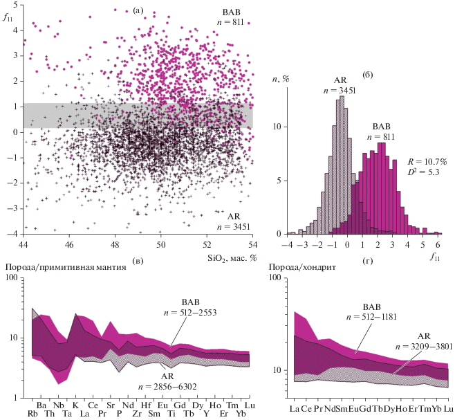 Сравнение химических составов архейских базальтов (AR) и базальтов современных задуговых бассейнов (BAB). (а) – диаграмма SiO2–дискриминантная функция f11 с фигуративными точками архейских базальтов (крестики) и базальтов задуговых бассейнов (кружки); (б) – распределение значений f11 для архейских базальтов и базальтов задуговых бассейнов; (в) – содержания редких элементов в архейских базальтах и базальтах задуговых бассейнов, нормированные по примитивной мантии; (г) – содержания редкоземельных элементов в архейских базальтах и задуговых бассейнов, нормированные по хондриту. BAB – задуговые бассейны Алеутской островной дуги, дуги Бисмарка, Японских дуг, дуг Кермадек, Тонга, Скоша, Марианской, Камчатской и Новогебридской.