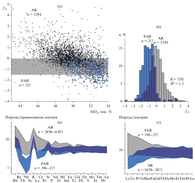 Сравнение химических составов архейских базальтов (AR) и базальтов современных преддуговых прогибов (FAB). (а) – диаграмма SiO2–дискриминантная функция f13 с фигуративными точками архейских базальтов (крестики) и базальтов преддуговых прогибов (кружки); (б) – распределение значений f13 для архейских базальтов и базальтов преддуговых прогибов; (в) – содержания редких элементов в архейских базальтах и базальтах задуговых бассейнов, нормированные по примитивной мантии; (г) – содержания редкоземельных элементов в архейских базальтах и базальтах задуговых бассейнов, нормированные по хондриту. FAB – предуговые прогибы Изу-Бонинской, Марианской дуг и дуги Тонга.