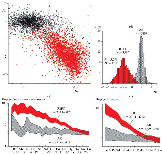 Сравнение химического состава архейских базальтов (AR) и базальтов континентальных рифтовых зон (RIFT). (а) – диаграмма Sr–дискриминантная функция f10 с фигуративными точками архейских базальтов (крестики) и базальтов континентальных рифтовых зон (кружки); (б) – распределение значений f10 для архейских базальтов и постдокембрийских базальтов континентальных рифтовых зон; (в) – содержания редких элементов в архейских базальтах и постдокембрийских базальтах континентальных рифтовых зон, нормированные по примитивной мантии; (г) – содержания редкоземельных элементов в архейских базальтах и постдокембрийских базальтах континентальных рифтовых зон, нормированные по хондриту.