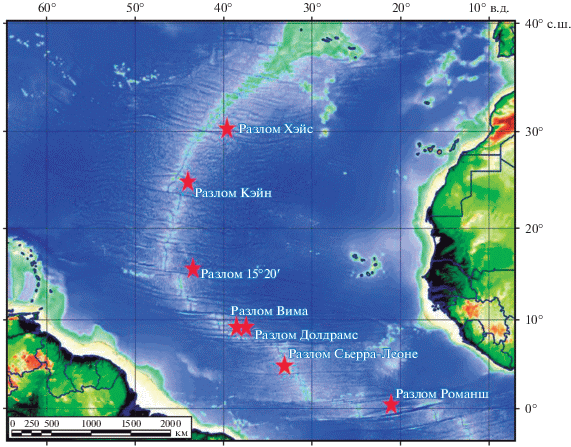 Трансформный разлом Романш с офсетом около 950 км является самым крупным в Атлантике. Он изучен в 13-ом и 16-ом рейсах НИС “Академик Страхов” (Bonatti et al., 1994) и рейсе G96 НИС “Геленджик” (Gasperini et al., 1997). В рейсе G96 НИС “Геленджик” в офсетной части разломной зоны, на ее западном пересечении с САХ и на северном склоне поперечного хребта были выявлены серпентиниты, габбро, долериты, базальты, литокластические брекчии и известняки. Часть вершины поперечного хребта, ранее выступавшей выше уровня моря, сложена рифовыми известняками с возрастом от 23 до 5 млн лет. Под известняками залегают базальты, габброиды и серпентинизированные перидотиты, находящиеся в тектонических взаимоотношениях друг с другом, а также деформированные осадочные отложения с возрастом от нижнего мела до среднего эоцена (Разницин, 2004).