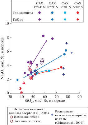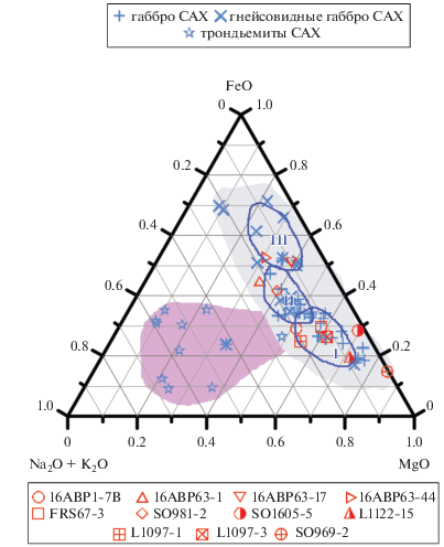 Общепринято, что продукты магматизма рифтовой долины САХ имеют современный возраст и связаны с магматическими расплавами, образованными при частичном плавлении двух главных в изотопно-геохимическом отношении мантийных резервуаров: деплетированного – DM и обогащенного – HIMU (например, Ноfmann, 1997; Jackson, Dasgupta, 2008; Workman, Hart, 2005). Относительный вклад этих резервуаров в магматизм САХ неодинаков в различных сегментах хребта, что определяет его вещественную сегментацию. Обнаружение геохимической сегментации, проявленной в базальтах и мантийных перидотитах осевой зоны САХ (Schilling et al., 1983; Klein, Langmuir, 1987; Дмитриев, 1998; Dosso et al., 1999; Силантьев, 2003), предоставило возможность реконструкции мантийных резервуаров, в которых генерируются магматические расплавы, родительские для MORB. В северном полушарии на всем протяжении САХ обнаружено чередование сегментов с мощным базальтовым слоем и сегментов, в которых базальтовый слой редуцирован, а океаническая кора сложена преимущественно плутоническими породами. Эти породы, как было замечено выше, представлены трондъемит-габбро-перидотитовой ассоциацией, участвующей в строении ВОК. Важнейшая особенность ВОК заключается в тесных соотношениях между слагающими их породами: жильный комплекс габбро в перидотитах, жильный комплекс плагиогранитов в габбро и перидотитах. Почти треть из общего объема изученных в настоящее время образцов абиссальных перидотитов содержит жилы и линзы магматических пород (Warren et al., 2015). Сильно деплетированные мантийные реститы в областях развития некоторых ВОК резко преобладают среди пород фундамента, в то время как базальтовый слой здесь редуцирован или отсутствует вообще. Это несоответствие лучше всего объясняется захватом базальтового расплава в субстрате малоглубинной мантии, что подтверждается частым присутствием в мантийных перидотитах жильных и дайковых тел габбро.