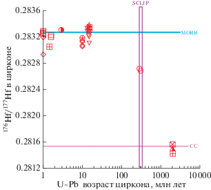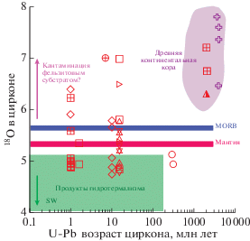 Полученные в последние десятилетия результаты изотопного датирования циркона, выделенного из перидотитов, габброидов, диоритов и трондьемитов ВОК в различных сегментах гребневой зоны САХ, позволяют предполагать существование здесь не только изотопно-геохимической неоднородности мантийного и корового субстратов, но и его возрастной гетерогенности. Приведенные в (Беляцкий и др., 1997; Pilot et al., 1998; Бортников и др., 2005, 2008, 2019; Сколотнев и др., 2010; Костицын и др., 2012, 2015, 2018; Bea et al., 2020) оценки возраста циркона, выделенного из пород ВОК, расположенных в осевой зоне САХ (или в близи нее), продемонстрировали их существенную неоднородность (от 0.8 до 3000 млн лет). Таким образом, возникает необходимость объяснения феномена присутствия древнего циркона в продуктах магматизма рифтовой долины, где образуется молодая океаническая кора. Следует заметить, что в ряде работ, посвященных изотопному датированию циркона, выделенного из плутонических пород, расположенных вне осевой зоны низкоскоростных срединно-океанических хребтов, приводятся возрастные оценки циркона, не соответствующие возрасту магнитных аномалий, установленных в том же районе, где были добыты изученные образцы, и позволяющие судить о цикличности магматизма в рифтовой долине. Высокоточное U-Pb датирование циркона из габбро САХ показало длительное эпизодическое образование океанической коры, что связывалось с кристаллизацией габбро в мантии с последующим подъемом в более высокие горизонты океанической коры и возобновлением магматизма (Schwartz et al., 2005; Grimes et al., 2008). U-Pb датирование циркона из габброидов керна скв. 735В на банке Атлантис (Юго-Западный Индийский хребет – ЮЗИХ) установило следующие возрастные интервалы импульсов магматизма, ответственных за аккрецию океанической коры в современной рифтовой долине ЮЗИХ: 12.18–11.99 млн лет, 11.97–11.93 млн лет, 11.94–11.90 млн лет и 0.27–0.29 млн лет (Baines et al., 2009; Rioux et al., 2016). Более молодой возраст пород океанического фундамента, чем возраст местных магнитных аномалий, интерпретируется как отражение одного или нескольких эпизодов магматической активности вне зоны спрединга (Baines et al., 2009). Синтез существующих данных о возрасте циркона, выделенного из пород внутренних океанических комплексов медленно-спрединговых хребтов, позволяет предполагать, что кристаллизация циркона в плутонических породах рифтовой долины протекает в интервале времени около 90 000–235 000 лет (Lissenberg et al., 2009).