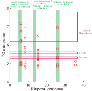 В настоящей работе предпринята попытка представить непротиворечивую геодинамическую интерпретацию данных о поведении U-Pb и Lu-Hf изотопных систем и об изотопном составе кислорода в цирконе, выделенного из плутонических пород, слагающих внутренние океанические комплексы САХ, расположенные на протяжении 2000 миль его гребневой зоны (рис. 1). Районы опробования находятся преимущественно на так называемых внутренних угловых поднятиях, маркирующих точки пересечения рифтовой долины с трансформными разломами и сложенными трондьемит-габбро-перидотитовой ассоциацией пород. В сферу внимания авторов статьи были включены также цирконы, полученные из плутонических пород, слагающих борта трансформных разломов или поперечные хребты (transverse ridge), расположенные в них. Таким образом, вовлеченные в настоящее исследование объекты, будучи связанными со всеми важнейшими тектоническими элементами гребневой зоны САХ, позволяют провести тестирование ряда основополагающих постулатов канонической модели спрединга в низкоскоростных срединно-океанических хребтах.