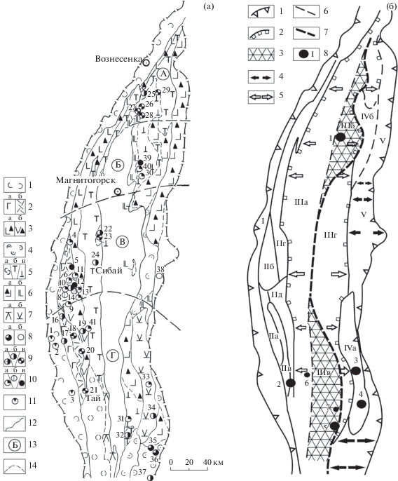 (а). Схематическая структурно-металлогенетическая карта Магнитогорского мегасинклинория, по И.Б. Серавкину (1986), с добавлениями А.М. Косарева и И.В. Головановой. (а): 1–7 – формации и комплексы: 1 – базальтовая ордовик-силурийская; 2 – базальт-риолитовая раннедевонско-эмсская: а – контрастный, б – непрерывный комплексы; 3 – андезибазальтовая среднедевонско-раннеэйфельская: а – базальт-андезибазальтовый, б – гибридный базальт-андезит-риолитовый комплексы; 4 – базальтовая раннедевонская эмсская; 5 – базальт-риолитовая среднедевонско-позднеэйфельско-раннеживетская: а – базальтовый, б – контрастный, в – непрерывный комплексы; 6а – андезибазальтовая среднедевонская позднеэйфельско-раннеживетская, 6б – базальт-андезито-базальтовая K-Na верхнедевонско-франская; 7 – базальт-андезит-риолитовая: юсинский (а) среднедевонский и джусинский (б) среднедевонско-раннеэйфельские комплексы; 8–11 – колчеданные месторождения: 8а – медноколчеданные (Домбаровский тип), 8б – цинковые (Филизчайский тип); 9 – Уральский тип: а – медно-цинковоколчеданные, Cu > Zn, б – цинково-медноколчеданные, Cu < Zn, в – цинково-медноколчеданные с полиметаллической минерализацией Zn > Cu; 10 – Баймакский тип: а – золото-серно-колчеданно-полиметаллические, б – золото-барит-полиметаллические, в – золото-колчеданные; 11 – Ивановский тип: кобальт-медно-цинково-колчеданные; 12 – границы Магнитогорской мегазоны и структурно-формационных зон I порядка; 13 – поперечные блоки; 14 – широтные дислокации. Названия колчеданных месторождений: 1 – Ивановское, 2 – Дергамышское, 3 – Ишкининское, 4 – Тубинская группа, 5 – Куль-Юрт-тау, 6 – Уваряж, 7 – Бакр-тау, 8 – Горная Байкара, 9 – Майское, 10 – Таш-тау, 11 – Таналык-Баймакское, 12 – Семеновское, 13 – Юлалинское, 14 – Туба-Каин, 15 – Балта-тау, 16 – Юбилейное, 17 – Бурибайское, 18 – Маканская группа, 19 – Подольское, 20 – Мамбетовское, 21 – Гайское, 22 – Бакр-Узяк, 23 – Южный Бакр-Узяк, 24 – Сибайское, 25 – Учалинское, 26 – Озерное, 27 – Узельгинское, 28 – Молодежное, 29 – Таш-Яр, 30 – Александринское, 31 – Иссиргужинское, 32 – Западно-Ащебутакское, 33 – Джусинское, 34 – Барсучий Лог, 35 – Летнее, 36 – Осеннее, 37 – Весеннее, 38 – Амурское, 39 – Сабановское, 40 – Бабарыкинское, 41 – Восточно-Подольское. (б). Реконструкция геодинамических обстановок Магнитогорской мегазоны (Косарев А.М.), срез – поздний эмс-эйфель. 1 – границы Магнитогорской мегазоны; 2 – границы зоны внутридугового спрединга; 3 – фрагменты надсубдукционной зоны тыловодужной позиции; 4 – зона раннедевонского задугового субконтинентального и океанического рифтогенеза; 5 – зона позднеэйфельского внутридугового спредингового бассейна; 6 – фрагмент контура минимума теплового поля; 7 – проекция реконструированного края субдукционной плиты в эйфельское время; 8 – колчеданные месторождения Магнитогорской мегазоны: 1 – Александринское, 2 – Гайское, 3 – Джусинское, 4 – Барсучий Лог, 5 – Западно-Ащебутакское, 6, 7 – мелкие колчеданные месторождения и рудопроявление: 6 – Юсинское, 7 – Иссиргужинское. Цифровые обозначения: I – Вознесенско-Присакмарская зона (ГУР), II – фрагмент фронтальной и развитой островной дуги в Западно-Магнитогорской зоне; IIа – площадь распространения позднеэмсского бурибайского вулканического комплекса; IIб – то же позднеэмсского верхнетаналыкского комплекса Баймакского рудного района; IIв – то же вер