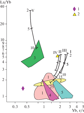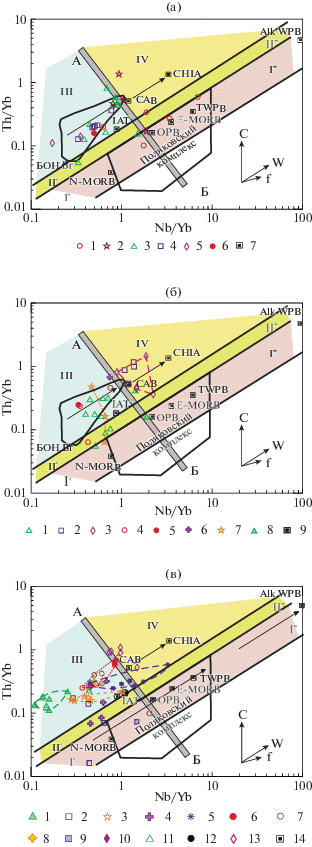 Островодужные колчеданоносные вулканические комплексы, содержащие крупные и суперкрупные колчеданные месторождения Гайское, Юбилейное и Подольское на рис. 2б располагаются в секторе с корой океанического типа (поле III). Единичные пробы вулканитов гайского и бурибайского комплексов оказываются в левой части полей I'–I" и II’–II", показывающих деплетированный состав мантийного клина верхней мантии. Рисунок 2 демонстрирует составы базальтов поля III (рис. 2а, знаки 1–6, соответствуют комплексам бонинитовой и толеитовой серий Вознесенско-Присакмарской зоны, вмещающей Co–Cu-колчеданное оруденение; рис. 2б – комплексы, базальты которых, возникали при высоких степенях плавления мантийного субстрата и содержат крупные колчеданные месторождения: 1 – бурибайский комплекс бонинитовой серии; 4 – гайский и 5 – подольский комплексы толеитовой островодужной серии, точки составов располагаются внутри поля базальтов бонинитовой серии и вблиз его). Эти типы базальтов возникли при высоких степенях парциального плавления вещества в надсубдукционном клине верхней мантии (рис. 4). В поле IV на рис. 2б, соответствующем островным дугам с корой островодужного и континентального типа, располагаются фигуративные точки составов базальтов: Баймакского рудного района с мелкими Au-колчеданно-полиметаллическими месторождениями и умеренными суммарными запасами (1047 тыс. т для 15 месторождений) Cu и Zn в пределах всего рудного района; Макан-Октябрьского рудного поля со средними по запасам колчеданными месторождениями. На разделительную линию АБ попадает состав базальта джусинского комплекса, содержащего средние по запасам Cu + Zn + Pb колчеданные барит-полиметаллические месторождения Джусинское и Барсучий Лог в Восточно-Магнитогорской зоне и Восточно-Подольское месторождение в Западно-Магнитогорской зоне на Подольском рудном поле.