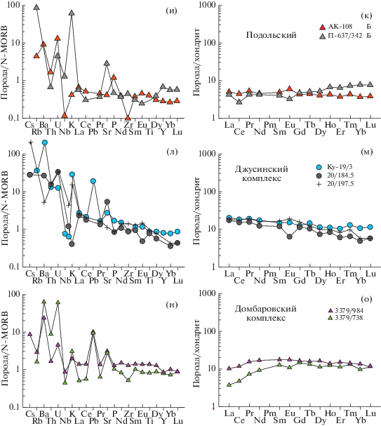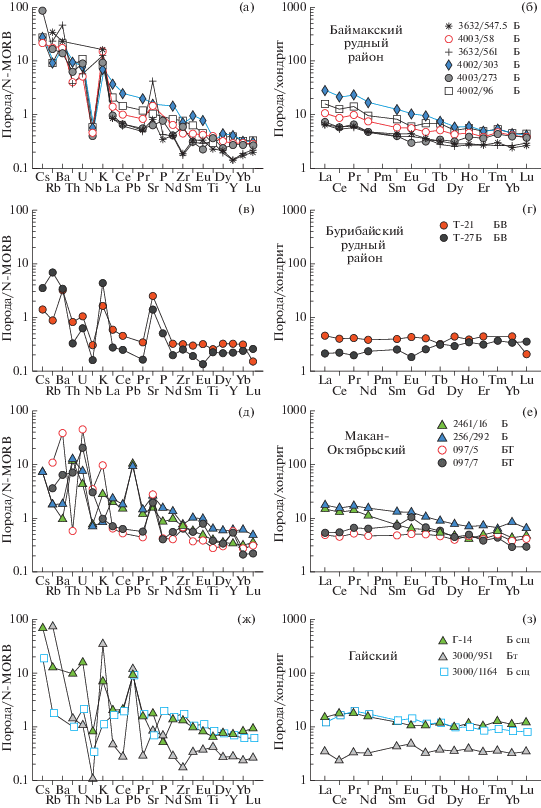2. Начальные этапы колчеданоносных островодужных позднеэмсcко-раннеэйфельского и позднеэйфельско-живетского вулканических циклов знаменуются формированием толщ океанических базальтов. В составе бурибайского комплекса это умеренно-титанистые (TiO2 1.54 мас. %) пиллоу-базальты (см. табл. 1, № п/п 3, проба Т-4Б), залегающие на границе нижней и средней толщ, по составу близкие к океаническим плато-базальтам (Косарев и др., 2005).