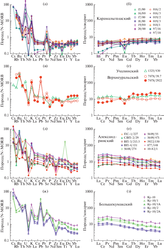 Фигуративные точки составов вулканитов Карамалыташской спрединговой зоны располагаются преимущественно в поле III на рис. 2б, которое соответствует области островной дуги с субокеанической корой. В этом поле располагаются составы базальтов учалинского, бакр-узякского, верхнеуральского, курпалинского, александринского, ащебутакского и карамалыташского (Карамалыташская антиклиналь) комплексов. Базальты карамалыташского комплекса (Сибайского и Учалинского рудных районов) на рис. 2в попадают в поле составов островных дуг с океанической корой; в переходное поле II′ с океанической корой попадают составы, переходные от островодужных к океаническим, островодужные толеитовые базальты учалинского комплекса; в поле II″, переходное от океанической коры повышенной мощности к островодужной коре, попадают базальты карамалыташского комплекса одноименной антиклинали и базальты Курпалинской зоны, промежуточной по геологическому положению между Учалинским и Верхнеуральским рудным районами.