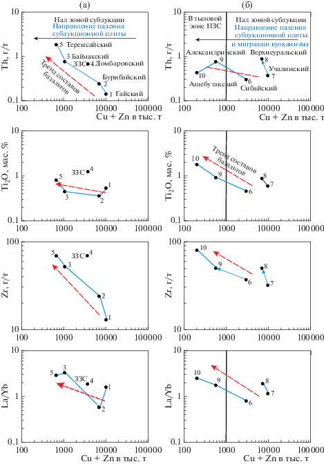 Пониженные концентрации Th в базальтах колчеданоносных комплексов (рис. 2б, 2в, рис. 6, табл. 1) характерны для полей I′, II′, III, базальты которых выплавлялись из деплетированных ультрабазитов надсубдукционного мантийного клина. Наиболее низкие концентрации Th установлены в колчеданоносных базальтах Гайского (Th 0.14 г/т), Бурибайского (0.24 г/т), Сибайского (0.3 г/т) и Учалинского (0.37 г/т) рудных районов, имеющих наибольшие запасы (Cu + Zn) в колчеданных месторождениях Магнитогорской мегазоны. Максимальные концентрации Th установлены в базальтах Баймакского (Th 0.76 г/т) и Теренсайского (Th 1.84 г/т) рудных районов с Au-колчеданно-полиметаллическим и барит-полиметаллическим оруденением в мелких и средних (по запасам рудогенных элементов) месторождениях. Повышенные концентрации Th установлены в базальтах Верхнеуральского (0.88 г/т) и Александринского рудных районов (0.76 г/т) с крупными и средними по запасам металлов колчеданными месторождениями.