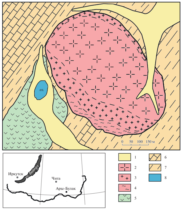 Схема геологического строения массива Ары-Булак по (Антипин и др., 2009). 1 – четвертичные отложения; породы Ары-Булакского массива: 2 – крупнопорфировые онгониты центральной фации, 3 – онгониты краевой фации, 4 – закаленные мелкозернистые и стекловатые, иногда флюидальные породы эндоконтактовой фации, 5 – субщелочные базальты, андезибазальты, 6 – известняки слабометаморфизованные, 7 – сланцы, кристаллические сланцы, 8 – периодически пересыхающее оз. Онгонит. На врезке показано положение массива Ары-Булак на территории Забайкалья.