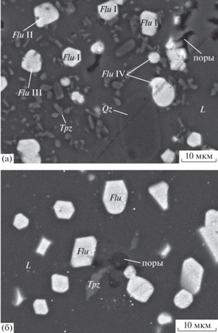 Поскольку округлые кристаллы флюорита воспринимаются некоторыми исследователями как продукты закалки фторидно-кальциевого расплава, остановимся подробнее на морфологических особенностях этой фазы. Флюорит в экспериментальных образцах представлен как ограненными кристаллами с хорошо выраженными гранями и вершинами, так и округлыми зернами без характерных кристаллических очертаний. Необходимо отметить, что во всех изученных экспериментальных образцах в форме зерен флюорита проявлены все разновидности, характеризующие постепенный переход от ограненных до округлых разностей. На рисунке 3а представлено фото участка образца, в котором содержатся: зерна флюорита с хорошо выраженными вершинами и гранями (Flu I); зерна, в которых выражены грани, а вершины скруглены (Flu II); округлые зерна, в которых прослеживаются только следы граней (Flu III), и округлые зерна без граней (Flu IV). В образцах иногда встречаются зерна, в которых только часть граней и вершин хорошо сформирована, остальные имеют округлые очертания (рис. 3б).