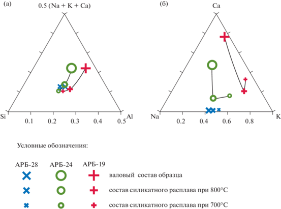 Валовый состав породы при переходе от эндоконтактовой зоны (обр. АРБ-19) к флюоритсодержащим порфировым онгонитам (обр. АРБ-24) изменяется (рис. 5) в сторону увеличения значения отношения Si/Al при относительно небольшом изменении суммы щелочных и щелочноземельных металлов. Полученные экспериментальным путем тренды кристаллизации образцов, напротив, показывают значительное уменьшение суммы (Na + + K + Ca) в составе остаточных расплавов (рис. 5а). От пород эндоконтакта к флюоритсодержащим онгонитам значительно увеличивается значение отношения Na/K. В остаточных расплавах при 800°С это отношение примерно равно значениям в валовых составах, а при 700°С расплав приобретает более калиевую специфику (рис. 5б). В соответствии с экспериментально полученными направлениями изменения состава остаточного расплава, очевидно, что образцы АРБ-19 и АРБ-24 не являются последовательными дифференциатами единого магматического расплава.
