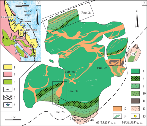(а) Схема геологического строения района с. Гридино (Слабунов, 2008) и (б) детальная схема геологического строения участка Самылино. (а) 1–3 – архей: 1 – Гридинская зона эклогитсодержащего меланжа: ТТГ-гнейсы с телами амфиболитов, эклогитов, цоизититов, ультитамафитов, 2 – ТТГ-гнейсы, 3 – амфиболиты Центрально-Беломорского пояса; 4 – элементы залегания гнейсовидности, метаморфической полосчатости (цифры на рис. б – углы погружения); 5 – надвиговые границы зоны меланжа: а – установленные, б – предполагаемые; 6 – местонахождение участков работ. (б) 7 – слабо ретроградно измененные эклогиты и 8 – они же с высоким содержанием граната; 9 – Grt-Di-Pl породы; 10 – гранатовые амфиболиты и гранатиты; 11 – амфиболиты; 12 – гранодиоритовые гнейсы; 13 – мигматизированные ТТГ-гнейсы; 14 – лейкократовые Di-Pl обособления; 15 – место отбора обр. GR170.