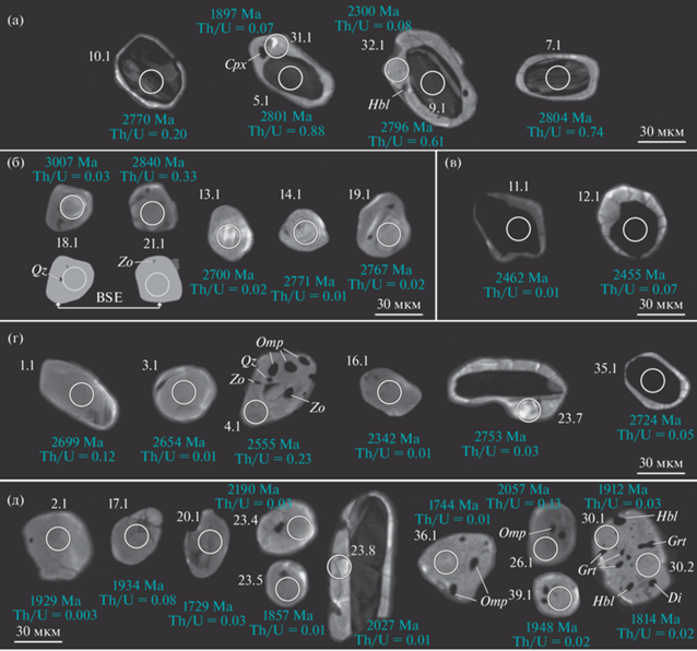 Цирконы были выделены из обр. GR170, отобранного в центральной части тела эклогитов (рис. 1б). Из пробы массой около 500 г было сепарировано 142 зерна циркона. Популяция цирконов по размерам была разделена на две фракции: крупные 50–150 мкм и мелкие 20–50 мкм. По морфологическим особенностям среди цирконов выделяются три группы (рис. 10): 1) округлые однородные светлые в CL-изображении зерна с редкими минеральными включениями. Такие зерна распространены как в мелкой, так и в крупной фракции. В отдельную подгруппу следует выделить округлые темные однородные в CL-изображении зерна с тонкими светлыми каймами обрастания; 2) удлиненно-призматические (Kуд = 2–3) зерна с темными зональными в CL-изображении ядрами и с тонкими светлыми каймами вокруг них. Эта группа отмечена только в крупной фракции; 3) изометричные, относительно крупные (около 100 мкм) зерна с многочисленными округлыми минеральными включениями, представленными Omp (Jd 26, 34%), Zo, Qz, Dol (рис. 10д).