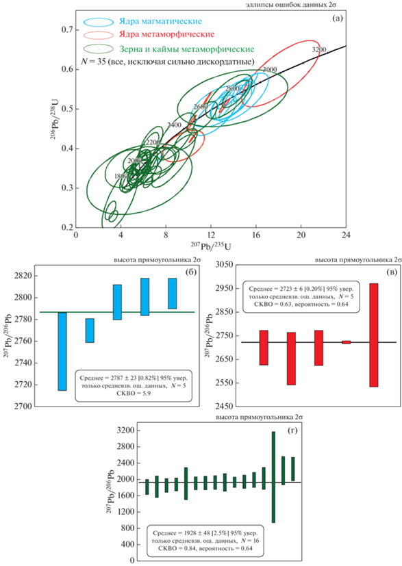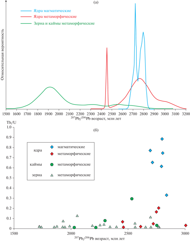 Измеренные 207Pb/206Pb возраста цирконов варьируют в широких пределах от 3008 до 1750 млн лет (табл. 1, рис. 11а), но при этом отмечается несколько пиков на графике их распределения: 2.8, 2.7, 2.46, 1.9 млрд лет. Цирконы отличаются также по соотношению Th/U: выделяются разности с низкими значениями Th/U < 0.1–0.2, что обычно характерно для метаморфических цирконов, и разности с высокими значениями Th/U > 0.1–0.2, что типично для магматических цирконов (Corfu et al., 2003; Wu, Zheng, 2004). Исходя из этого, среди разновозрастных цирконов магматическую природу имеют только цирконы архейских ядер (рис. 11б).