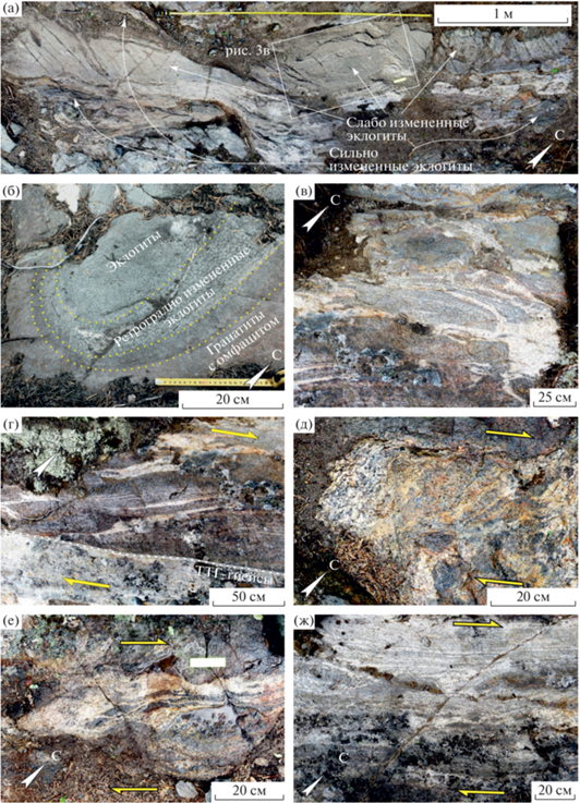 Второй случай поздних деформаций установлен в северной краевой части будины. В этой части метаморфическая полосчатость подчеркнута жильным материалом мигматитов и деформирована несколькими мелкими зонами сдвигового течения, две из которых показаны на рис. 3в. Эти зоны деформируют наиболее раннюю мигматитовую полосчатость, преобладающую в будине. С описанными выше складками зоны сдвигового течения они объединяют внедрение (вдоль северной из них) жильного гранитоидного материала. Однако их кинематика не согласуется с правосторонним горизонтальным сдвиговым течением главного этапа деформации. Представляется, что, как и в предыдущем случае, это результат преобразований эклогитов на более поздних стадиях деформации, ретроградного метаморфизма и локальной мигматизации.