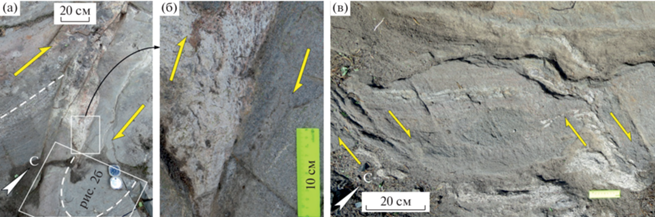 Структурные формы поздних стадий деформации в будине ретроградно измененных эклогитах участка Самылино. (а) – жила гранодиорита, залечившего короткое сорванное крыло, общее для двух смежных асимметричных складок (граница между двумя слоями, смятыми в складки, показана пунктиром); (б) – сигмоидальные изгибы сланцеватости, возникшей в гранодиорите во время срыва крыла на поздней стадии складкообразования; (в) – поздние мелкие зоны сдвигового течения, по которым, как и по сорванному крылу, внедрялся гранодиоритовый жильный материал.