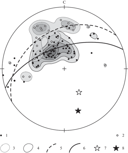 Ориентировка плоскостных текстур в будинах ретроградно измененных эклогитов участков Самылино и Столбиха (равноплощадная проекция на нижнюю полусферу; программа “OpenStereo 0.1.2 devel”, C.H. Grohmann, G.A.C. Campanha). 1, 2 – полюсы плоскостных текстур: 1 – Самылино (N = 22), 2 – Столбиха (N = 65; усредненный азимут падения 158°, угол 31°); 3, 4 – изолинии плотности распределения полюсов (%): 3 – Самылино, 4.0–8.0–12.1–16.1, 4 – Столбиха, 2.7–5.5–8.2–10.9–13.7–16.4; 5, 6 – большие круги рассеивания полюсов: 5 – Самылино, 6 – Столбиха; 7, 8 – π-оси (оси вращения): 7 – Самылино (усредненный азимут погружения 148°, угол 53°), 8 – Столбиха (усредненный азимут погружения 158°, угол 31°).