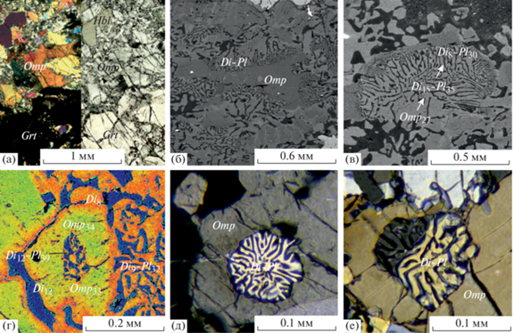 Микрофотографии массивных слабо измененных эклогитов участка Самылино. (а) – крупные реликты омфацита и граната в эклогитах (с анализатором и без); (б) – соотношение омфацита и симплектитовых Di-Pl срастаний в породе; (в) – последовательное замещение омфацита Di-Pl симплектитами с постепенным утонением срастаний и снижением содержания жадеитового компонента в клинопироксене; (г) – зерно омфацита с включением Di-Pl симплектитов в центральной части и обрастанием диопсида в краевой части; (д, е) – обособленные Di-Pl симплектитовые включения в монокристаллах омфацита. (б–г) – BSE-изображения; (д, е) – изображения в оптическом микроскопе с анализатором.