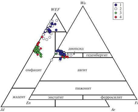 Диаграмма состава клинопироксена. 1 – включения Diвкл-Pl симплектитов в зернах омфацита и граната; 2 – поздние Di3–4-Pl симплектиты; 3 – Omp1 в матриксе породы; 4 – Omp2 включения в гранате; WEF – Ca-Mg-Fe пироксены волластонит-энстатит-ферросилит.