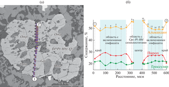 Гранат из эклогитов участка Самылино. (а) – зерно граната с зональным распределением минеральных включений: в центральной части – Di-Pl-Hbl симплектиты, в промежуточной части преобладают включения Omp, Qz (±Hbl, Pl); (б) – диаграмма изменения химического состава граната (а) по профилю 1–17 (BSE-изображение).