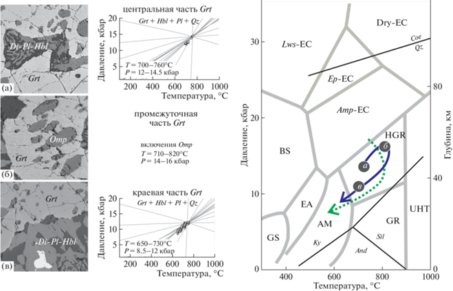 Микрофотографии зон роста кристаллов граната в реликтах массивных эклогитов в центральной части будины обр. GR170 участка Самылино и результаты расчета Р-Т параметров их образования. (а–в) – центральная, промежуточная и краевая зоны соответственно (на правой диаграмме в кружках а, в – Р-Т параметры рассчитаны по программному комплексу TWQ (Berman, 1991); б – по (Powell, 1985) и (Holland, 1980)). Р–Т диаграмма с Р-Т-t трендом, отражающим метаморфическую историю самылинских эклогитов; для сравнения зеленым пунктиром показан Р-Т-t тренд метаморфической эволюции палеопротерозойских эклогитов о. Столбиха (Максимов, 2019б). Фации метаморфизма: GS – зеленых сланцев, EA – эпидот-амфиболитовая, AM – амфиболитовая, GR – гранулитовая, HGR – высокобарная гранулитовая, UHT – область сверхвысоких температур, BS – голубых сланцев, Amp-EC – амфибол-эклогитовая, Ep-EC – эпидот-эклогитовая, Lws-EC – лавсонит-эклогитовая, Dry-EC – область сухих эклогитов.