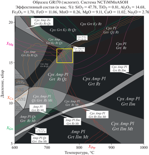 P-T параметры кристаллизации Grt-Omp минерального парагенезиса, отражающего около пиковые условия эклогитового метаморфизма, были рассчитаны с помощью валового состава породы из центральной части будины, обр. GR170. Изоплеты составов промежуточной (рис. 7а, 8б) части граната (XPrp и XGrs) и изоплеты омфацита (XСа = Ca/(Ca + Na) и XMg = Mg/(Mg + Fe2+)) пересекаются в узкой области при T = 750–800°C и P = 14–16 кбар (рис. 9). Эти значения соответствуют параметрам зоны перехода от эклогитовой фации метаморфизма к высокобарной гранулитовой фации, которая характеризуется появлением плагиоклаза.