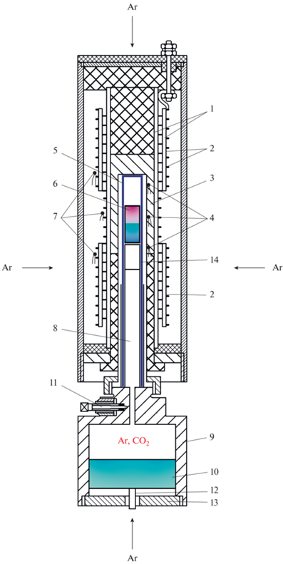 Схема оригинального внутреннего устройства (уравнитель-разделитель) установки высокого газового давления с нагревателем. 1, 3 – изоляторы; 2 – двухсекционный нагреватель; 4 – измерительные термопары; 5 – молибденовый реактор; 6 – Pt-ампула с расплавом диффузионной пары; 7 – регулирующие термопары; 8 – заглушка; 9 – корпус уравнителя-разделителя; 10 – поршень; 11 – вентиль; 12 – датчик положения поршня; 13 – крышка; 14 – Pt-ампула с кислородным буфером (Persikov et al., 2018).