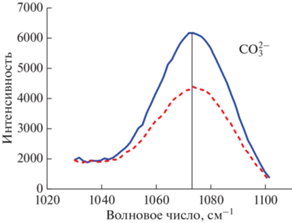 Спектры комбинационного рассеяния (рамановская спектроскопия) в диапазоне 1020–1120 см–1 для диффузионной пары модельные кимберлит–базальт, иллюстрирующие карбонатные пики (${\text{СО}}_{3}^{{2 - }}$) при 1073 см–1. Сплошная линия – зона кимберлита, пунктирная – диффузионная зона, граница Монтана.